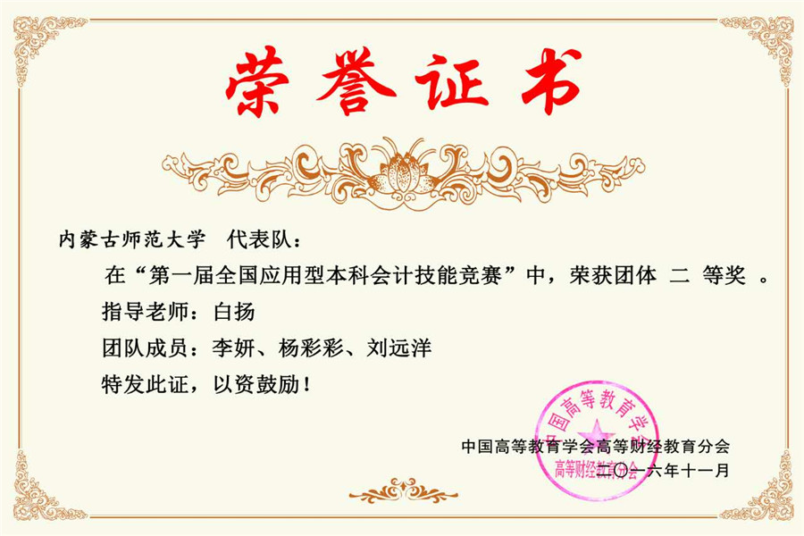 代表队荣获团体二等奖,白扬老师获得优秀指导教师称号,三位参赛选手各自均获得会计手工帐一等奖,会计电算化二等奖的优异成绩。