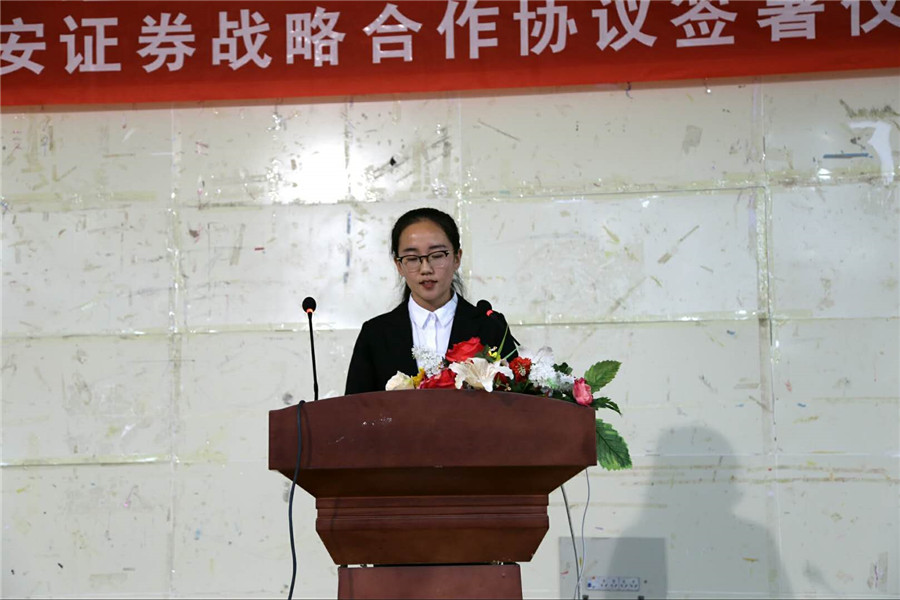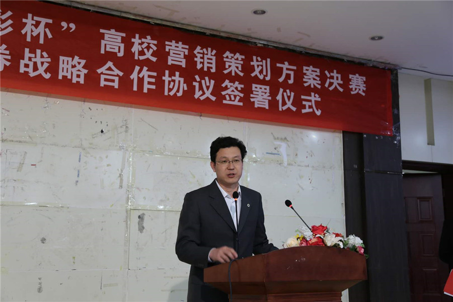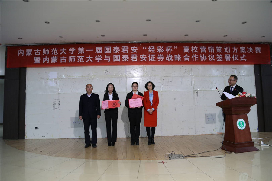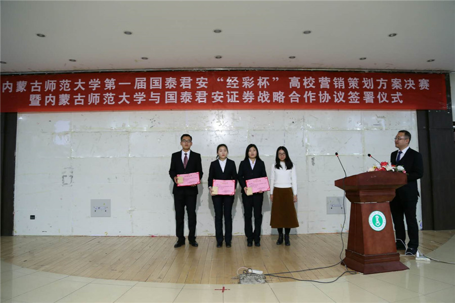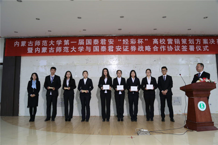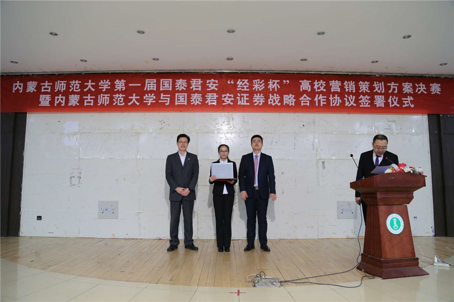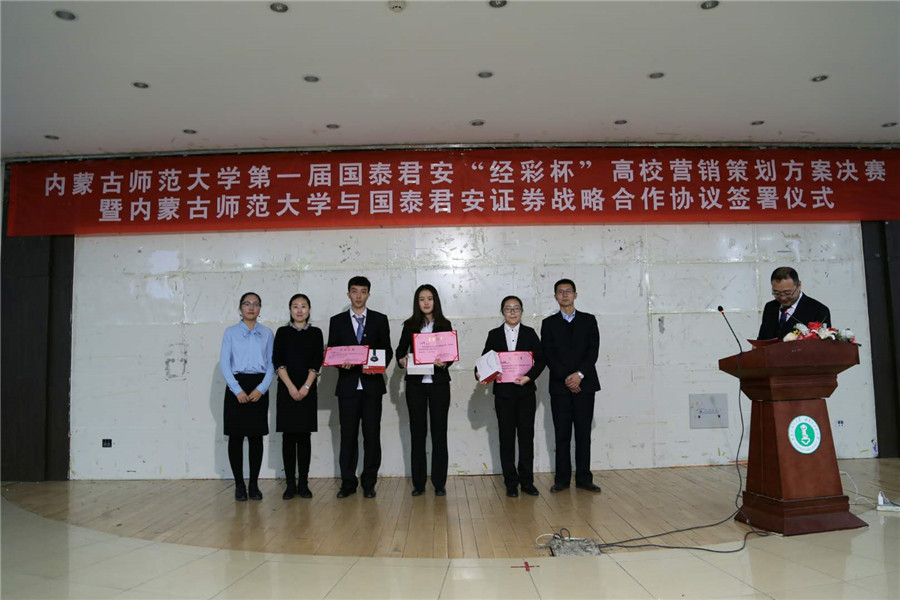 就业指导处与国泰君安证券合作协议签署仪式在图书馆一楼报告厅举行。就业指导处处长王志强、国泰君安证券内蒙古分公司副总经理徐锡海、经济学院党总支副书记单金平等同志作为评委出席了比赛。此次营销策划方案决赛是国泰君安“经彩杯”系列比赛的第二轮,在此之前,第一轮模拟炒股大赛已经成功举办。