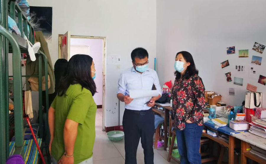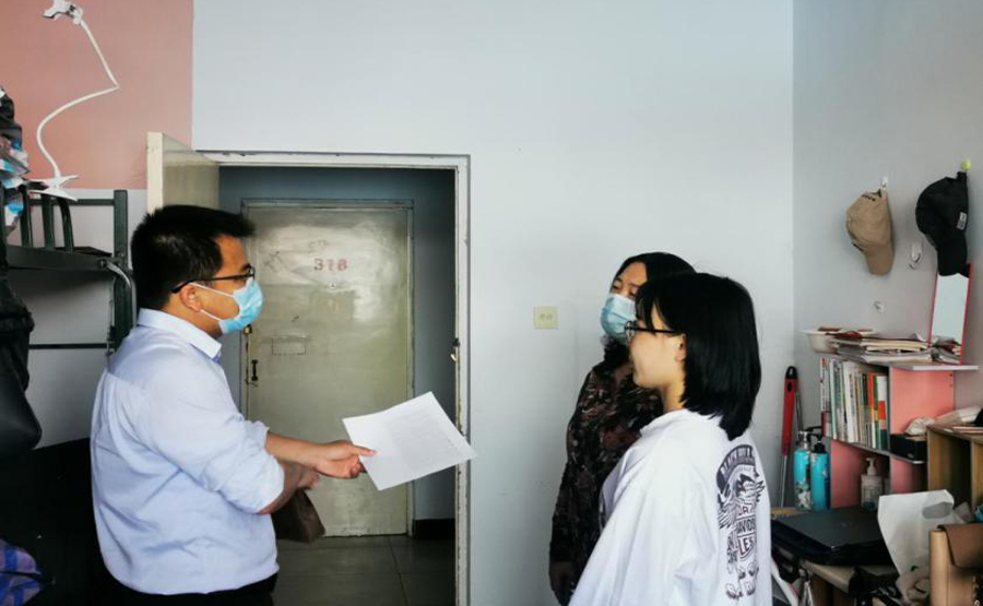 5月31日,水蜜桃直播 第二批次21名本、硕士生返校复课。下午,包凤兰、安广峰以及辅导员到学生寝室看望返校学生。