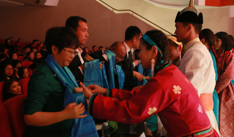 17级经济学蒙班同学为到场嘉宾进献哈达