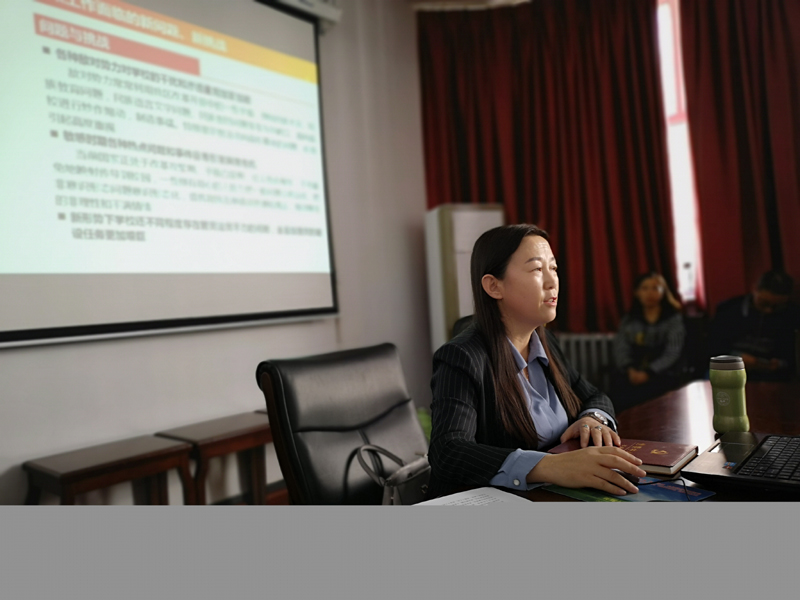 包凤兰书记围绕2018年学校党建与思政工作总结、学校党建与思政工作面临的新问题和新挑战、学校党建与思政工作中存在的问题以及如何做好党建与思政工作等四个方面带领全体教职工,深入学习了黄雅丽书记的讲话精神。