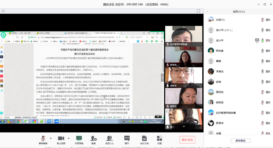2020年4月9日,财会与管理党支部开展主题党日活动,由支部书记成小平主持,共11名党员参加,王奕君老师因事请假。本次活动通过视频会议的方式,共同观看了视频《中国共产党第十九届中央纪律检查委员会第四次全体会议公报》、《习近平在十九届中央纪委四次全会上发表重要讲话》,集体学习了《中国共产党内蒙古自治区第十届纪律检查委员会第六次全体会议决议》。与会党员一致认为,习近平总书记的重要讲话,科学总结了新时代全面从严治党的伟大成就和宝贵经验,深刻阐明了不忘初心、牢记使命和全面从严治党的必要性和重要性,充分展示了党中央不断巩固发展反腐败斗争压倒性胜利的坚定决心,是新时代深入推进全党自我革命的行动纲领。要把习近平总书记重要讲话精神学习领会好,把中纪委全会和自治区纪委全会精神贯彻落实好,切实把全面从严治党主体责任扛在肩上,用党的建设引领带动各项工作提质增效。