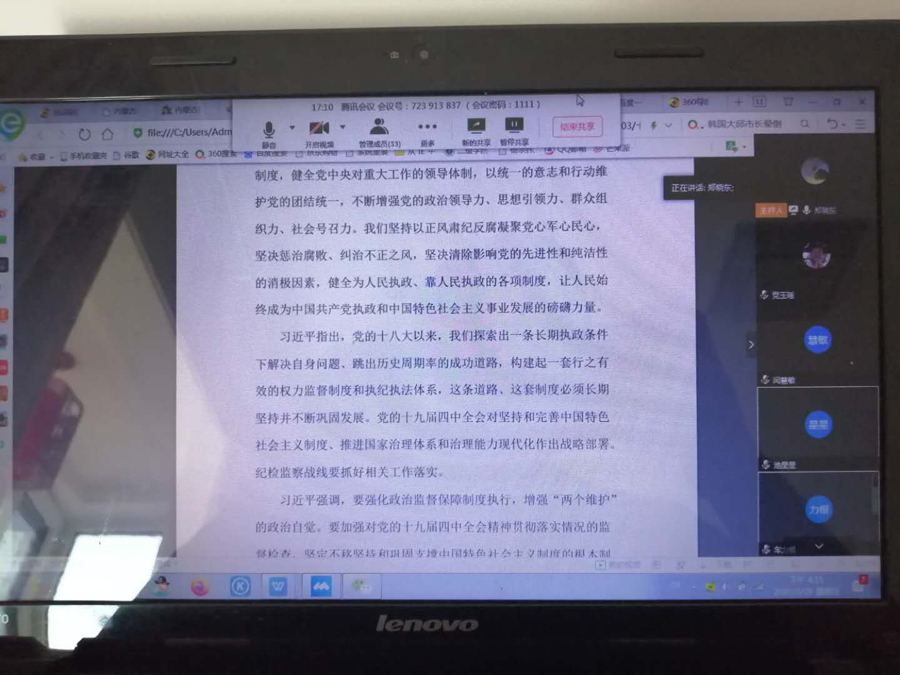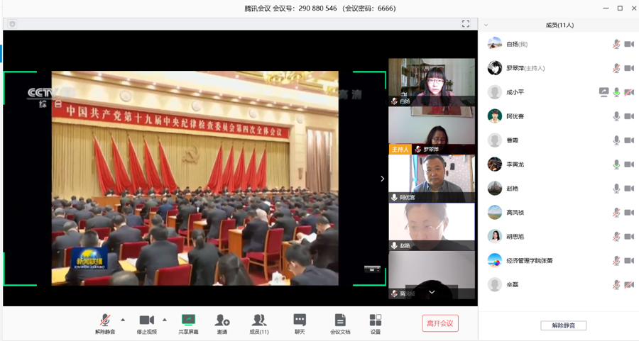 众志成城、共克时艰。2020年4月2日,经济与金融党支部全体11名党员以视频会议形式开展了主题党日活动,学习了《中共中央第十九届中央纪律检查委员会第四次全体会议公报》和《习近平在十九届中央纪委四次全会上的重要讲话》,由支部书记杨蕴丽主持并进行了领学。