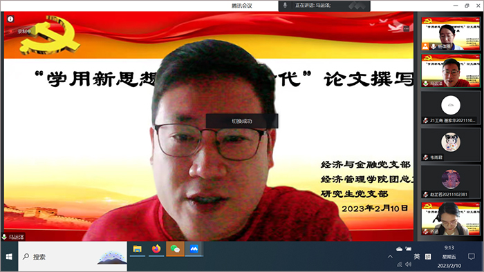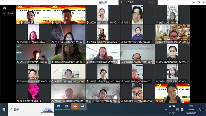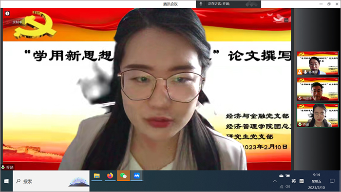 团总支、研究生党支部2月10日联合举办“学用新思想,建功新时代”理论文章撰写专题讲座。讲座由团总支书记马运泽主持,研究生党支部书记乔涵担任主讲嘉宾,经济与金融党支部书记杨蕴丽做了点评,280余名本科生和研究生在线聆听了讲座。