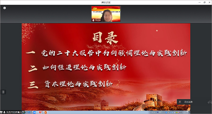 经济与金融党支部包秀琴老师围绕党的二十大报告中强调理论与实践创新的原因、意义以及如何推进理论和实践创新进行了详细阐述,并从资本理论与实践创新视角结合经济学理论,分析了实现资本理论和实践创新要做到了“七个坚持”。
