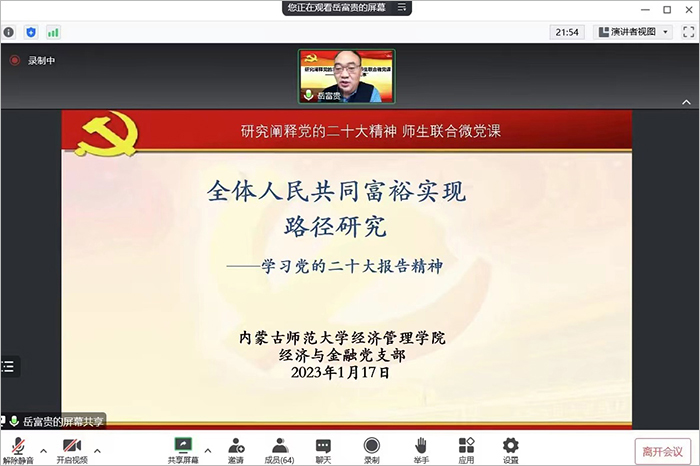 为持续深入学习贯彻党的二十大精神,经济与金融党支部联合研究生党支部、本科生第一党支部举办的“研究阐释党的二十大精神 师生联合微党课”主题党日活动第二期于2023年1月17日在线进行。第二期微党课主题是“新时代三件大事”,会议由乔涵主持,杨蕴丽、岳富贵、宝苏雅拉、苏雅拉等教师及60余名学生党员参加此次微党课学习。岳富贵、丘土鑫、刘昱昕担任本次微党课主讲嘉宾。