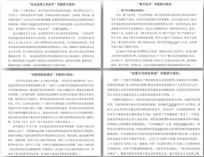 此次研讨活动共分为11个小组,分别针对二十大报告中11个重点专题内容展开学习研讨和交流分享,并形成了高质量研讨报告。专题研讨内容主要包括:“新发展格局构建”“抗击疫情人民战争”“创新型国家建设”“中国式现代化”“铸牢中华民族共同体意识”“发展方式绿色转型”“科技计划管理体系”“碳达峰碳中和”“乡村振兴”“数字经济”“六个必须坚持”等。