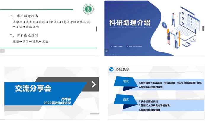 4名同志结合自身科研、就业、升学经验,分别就博士招考报名和学术论文撰写流程;科研助理的主要工作内容和工作经验;经济学类专业可报考的公务员岗位及备考准备;商业银行笔试面试注意事项等方面进行交流,向研究生们分享了丰富的升学求职经验。
