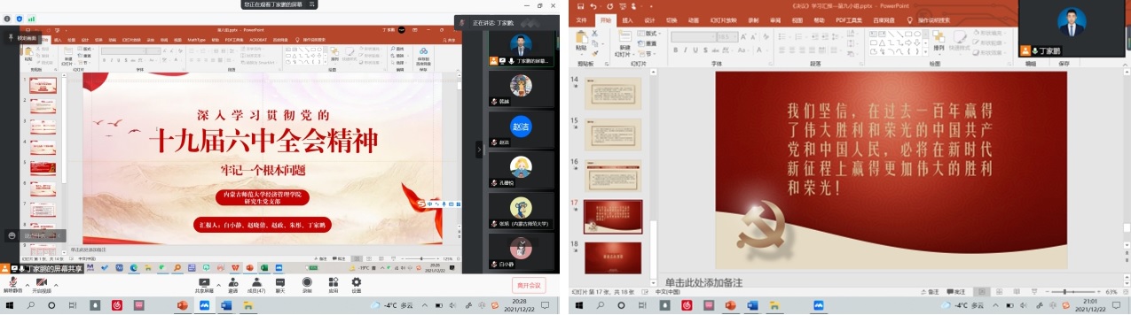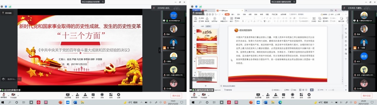研究生党支部于12月22日召开《中共中央关于党的百年奋斗重大成就和历史经验的决议》学习汇报大会。会议由研究生党支部书记乔涵主持,支部全体党员、党员发展对象、入党积极分子参加会议。