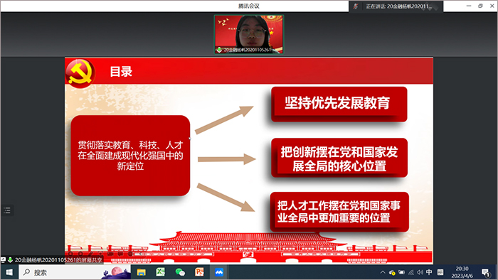 为学习贯彻习近平新时代中国特色社会主义思想和党的二十大精神,4月6日经济与金融党支部联合研究生党支部、本科生第一党支部在线举行第七期“研究阐释党的二十大精神”师生联合微党课,主题是“创新发展”。微党课由杨蕴丽主持,65位师生党员和积极分子参加了学习讨论。姜楠、滕怀雅、杨帆3位同志担任了主讲嘉宾。