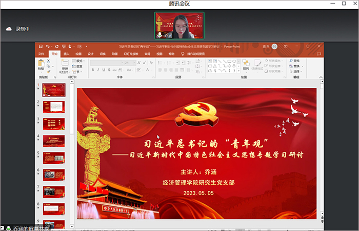 研究生党支部于2023年5月5日在线召开习近平新时代中国特色社会主义思想专题集中学习研讨会。会议由研究生党支部书记乔涵主持,支部全体党员、入党积极分子参加会议。