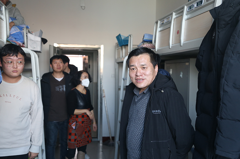 领导智如水、胡伟华、辅导员马运泽、郭喜桐、宝苏雅拉深入学生公寓,倾听学生诉求、排查安全隐患。