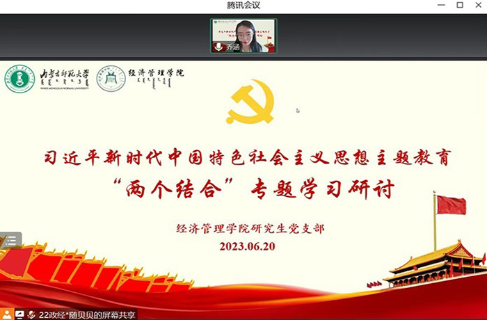 研究生党支部于2023年6月20日召开习近平新时代中国特色社会主义思想主题教育——“两个结合”专题学习研讨会。会议由支部书记乔涵主持,支部全体党员、党员发展对象、入党积极分子参加会议。