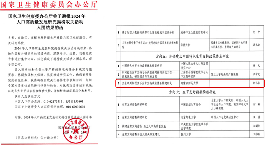 近日,国家卫生健康委员会办公厅公布了2024年人口高质量发展研究揭榜攻关活动入围名单。经过专家评审,围绕13个攻关方向共有74个研究项目入围。水蜜桃直播 胡伟华教授团队提交的攻关任务《全生命周期视角下生育支持政策体系构建研究》成功入围,是自治区唯一入围此次揭榜攻关活动的研究项目。研究团队将严格按照攻关任务和研究时限,扎实推进研究工作,高质量完成攻关任务。