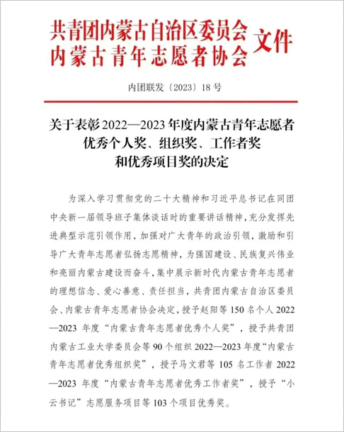 近日,内蒙古自治区关于表彰2022—2023年度内蒙古青年志愿者优秀个人奖、组织奖、工作者奖 和优秀项目奖的决定揭晓,经自治区团委评审,水蜜桃直播