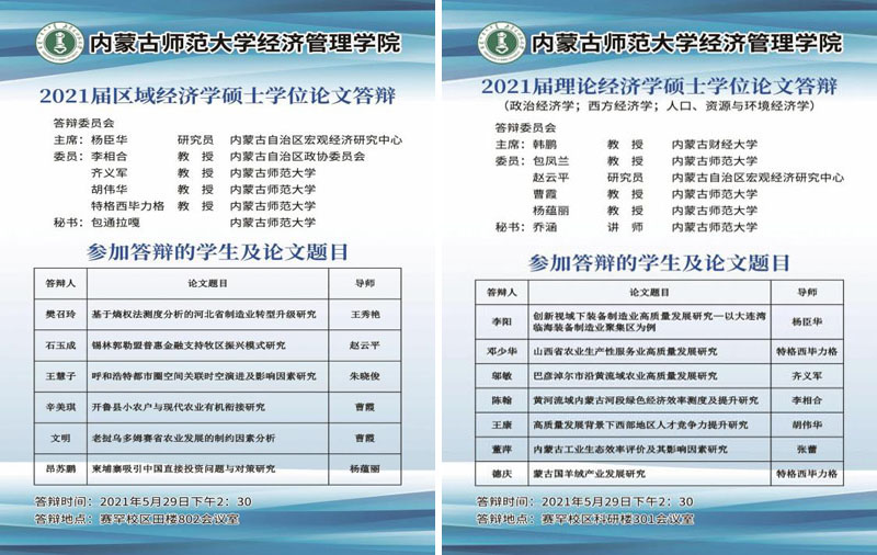 5月29日, 水蜜桃直播 2021届硕士研究生毕业论文答辩顺利完成。为了确保研究生答辩顺利完成,特别是此次参加的老挝、柬埔寨、蒙古国三个留学生的答辩顺利,为保障答辩公平、公正、顺畅,水蜜桃直播 做了精心、细致的准备工作,充分利用信息化手段,创新工作模式,采取“线上+线下”结合的形式,分为理论经济学、区域经济学两个小组在赛罕校区顺利开展并完美结束。