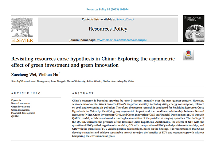 近日,胡伟华教授作为通讯作者与马来西亚理工大学在读博士生魏学成合作撰写的论文“Revisiting resources curse hypothesis in China: Exploring the asymmetric effect of green investment and green innovation”,发表在国际期刊“Resources Policy”(on-line)。该期刊在中科院期刊分区中位于经济学一区(TOP),实现了水蜜桃直播