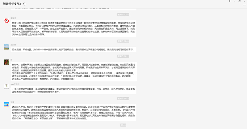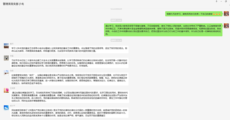 会上,党支部书记贾曼莉带领大家学习了习近平总书记关于党纪学习教育的重要讲话和重要指示精神。会议强调,党性、党风、党纪是有机整体,党性是根本,党风是表现,党纪是保障。纪律是管党治党的“戒尺”,也是党员、干部约束自身行为的标准和遵循。要深入学习贯彻习近平总书记关于党纪学习教育的重要讲话和重要指示精神,把党纪学习教育作为重要政治任务,坚持从学纪入手,推动广大党员强化遵守纪律的自觉,以严明的纪律坚定拥护“两个确立”、坚决做到“两个维护”,保障学校和学院各项事业的发展。会后,党员在党支部微信平台上交流了自己的心得体会。